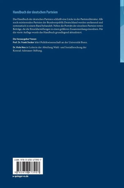 Das Handbuch der deutschen Parteien schließt eine Lücke in der Parteienliteratur. Alle noch existierenden Parteien der Bundesrepublik Deutschland werden umfassend und systematisch in einem Band behandelt. Neben die Porträts der einzelnen Parteien treten Beiträge, die die Einzeldarstellungen in einen größeren Zusammenhang einordnen. Für die vierte Auflage wurde das Handbuch grundlegend aktualisiert.