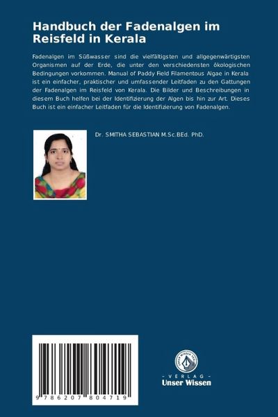 Fadenalgen im Süßwasser sind die vielfältigsten und allgegenwärtigsten Organismen auf der Erde, die unter den verschiedensten ökologischen Bedingungen vorkommen. Manual of Paddy Field Filamentous Algae in Kerala ist ein einfacher, praktischer und umfassender Leitfaden zu den Gattungen der Fadenalgen im Reisfeld von Kerala. Die Bilder und Beschreibungen in diesem Buch helfen bei der Identifizierung der Algen bis hin zur Art. Dieses Buch ist ein einfacher Leitfaden für die Identifizierung von Fadenalgen.