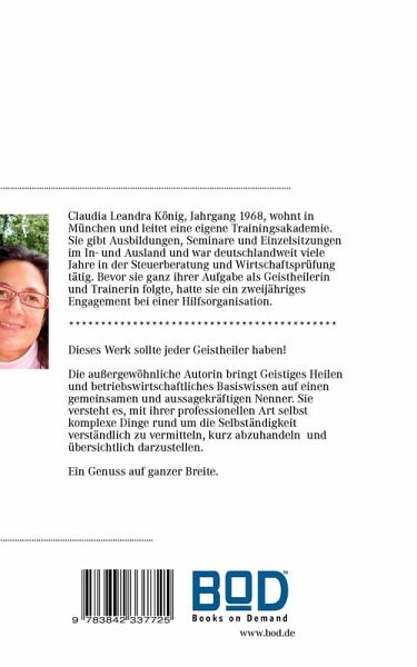 Dieses Werk sollte jeder Geistheiler haben!Die außergewöhnliche Autorin bringt Geistiges Heilen und betriebswirtschaftliches Basiswissen auf einen gemeinsamen und aussagekräftigen Nenner. Sie versteht es, mit ihrer professionellen Art selbst komplexe Dinge rund um die Selbständigkeit verständlich zu vermitteln, kurz abzuhandeln und übersichtlich darzustellen. Ein Genuss auf ganzer Breite.