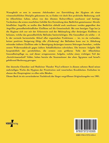 Der deutsche Chemiker und Mediziner Theodor Weyl erläutert in diesem zehnten Band seines mehrteiligen Werks die Hygiene der Prostitution und venerischen Krankheiten. Enthalten ist ebenso das Hauptregister zu allen zehn Bänden.