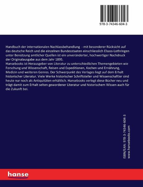 Handbuch der internationalen Nachlassbehandlung - mit besonderer Rücksicht auf das deutsche Reich und die einzelnen Bundesstaaten einschliesslich Elsass-Lothringen unter Benützung amtlicher Quellen ist ein unveränderter, hochwertiger Nachdruck der Originalausgabe aus dem Jahr 1895.