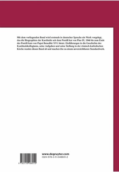 Nach dem Papst ist das Kardinalskollegium die höchste Instanz der römisch-katholischen Kirche. Neben der Leitung der großen Diözesen der Weltkirche und der Leitung der Dikasterien der römischen Kurie obliegt ihm die Wahl eines neuen Papstes. Im Laufe seiner Geschichte hat das Kardinalskollegium vielfältige Veränderungen erfahren. Besonders in den letzten zweihundert Jahren wuchs die Zahl von ursprünglich höchstens 70 Kardinälen auf mittlerweile über 200 Kardinäle an und erfuhr eine starke Internationalisierung. Das vorliegende Werk bietet neben Einführungen in die Geschichte und Gegenwart sowie Aufgaben und Bedeutung des Kardinalskollegiums die Biographien aller von 1846 bis 2012 ernannten Kardinäle und zeichnet so die Veränderungen und Wandlungen dieses einzigartigen Kollegiums nach.