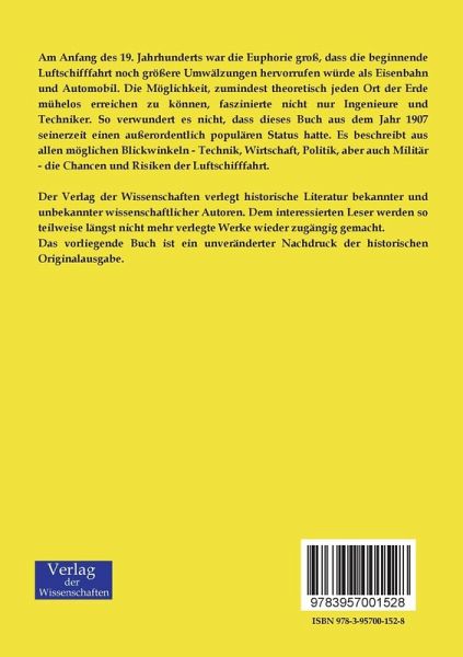 Am Anfang des 19. Jahrhunderts war die Euphorie groß, dass die beginnende Luftschifffahrt noch größere Umwälzungen hervorrufen würde als Eisenbahn und Automobil. Die Möglichkeit, zumindest theoretisch jeden Ort der Erde mühelos erreichen zu können, faszinierte nicht nur Ingenieure und Techniker. So verwundert es nicht, dass dieses Buch aus dem Jahr 1907 seinerzeit einen außerordentlich populären Status hatte. Es beschreibt aus allen möglichen Blickwinkeln - Technik, Wirtschaft, Politik, aber auch Militär - die Chancen und Risiken der Luftschifffahrt.