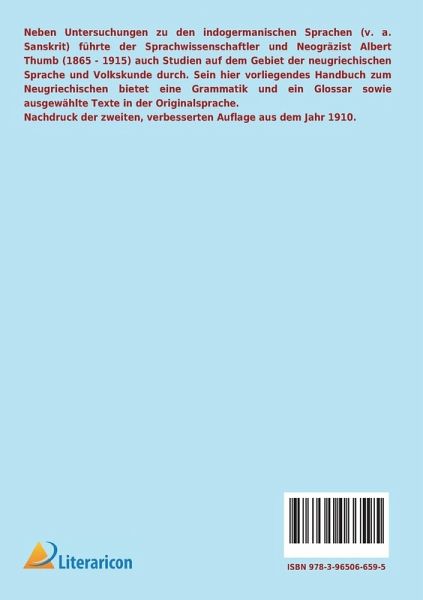 Neben Untersuchungen zu den indogermanischen Sprachen (v. a. Sanskrit) führte der Sprachwissenschaftler und Neogräzist Albert Thumb (1865 - 1915) auch Studien auf dem Gebiet der neugriechischen Sprache und Volkskunde durch. Sein hier vorliegendes Handbuch zum Neugriechischen bietet eine Grammatik und ein Glossar sowie ausgewählte Texte in der Originalsprache. Nachdruck der zweiten, verbesserten Auflage aus dem Jahr 1910.