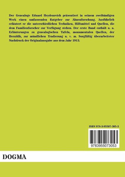 Der Genealoge Eduard Heydenreich präsentiert in seinem zweibändigen Werk einen umfassenden Ratgeber zur Ahnenforschung. Ausführlich erläutert er die unterschiedlichen Techniken, Hilfsmittel und Quellen, die dem Familienforscher zur Verfügung stehen. Der erste Band enthält u. a. Erläuterungen zu genealogischen Tafeln, monumentalen Quellen, der Heraldik, zur mündlichen Tradierung u. v. m. Sorgfältig überarbeiteter Nachdruck der Originalausgabe aus dem Jahr 1913.