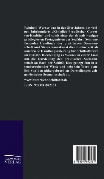 Reinhold Werner war in den 80er Jahren des vorigen Jahrhunderts Königlich-Preußischer Corvetten-Kapitän und somit einer der damals wenigen privilegierten Protagonisten der Seefahrt. Sein umfassendes Handbuch der praktischen Seemannschaft und Steuermannskunst diente seinerzeit als universelle Handlungsanleitung für Schiffsoffiziere im Einsatz. Hierbei ging es Werner in erster Linie um die Darstellung der praktischen Seemannschaft an Bord der Schiffe. Dies gelingt ihm in atemberaubender Weise und hebt sein Werk deutlich von den althergebrachten Darstellungen zeitgenössischer Seemannschaft ab.