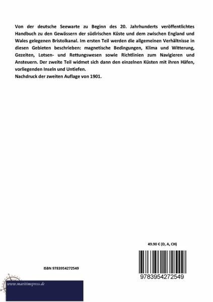 Von der deutsche Seewarte zu Beginn des 20. Jahrhunderts veröffentlichtes Handbuch zu den Gewässern der südirischen Küste und dem zwischen England und Wales gelegenen Bristolkanal. Im ersten Teil werden die allgemeinen Verhältnisse in diesen Gebieten beschrieben: magnetische Bedingungen, Klima und Witterung, Gezeiten, Lotsen- und Rettungswesen sowie Richtlinien zum Navigieren und Ansteuern. Der zweite Teil widmet sich dann den einzelnen Küsten mit ihren Häfen, vorliegenden Inseln und Untiefen.
