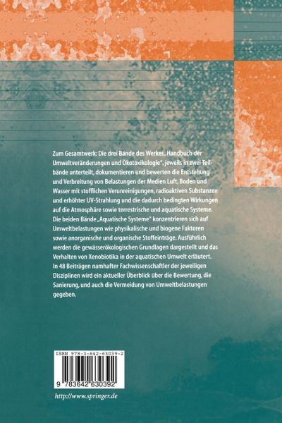 Die beiden Bände "Aquatische Systeme" konzentrieren sich auf Umweltbelastungen durch physikalische und biogene Faktoren sowie anorganische und organische Stoffeinträge. Ausführlich werden die gewässerökologischen Grundlagen dargestellt und das Verhalten von Xenobiotika in der aquatischen Umwelt erläutert. In 48 Beiträgen namhafter Fachwissenschaftler der jeweiligen Disziplinen wird ein aktueller Überblick über die Bewertung, die Sanierung und die Vermeidung von Umweltbelastungen vermittelt.