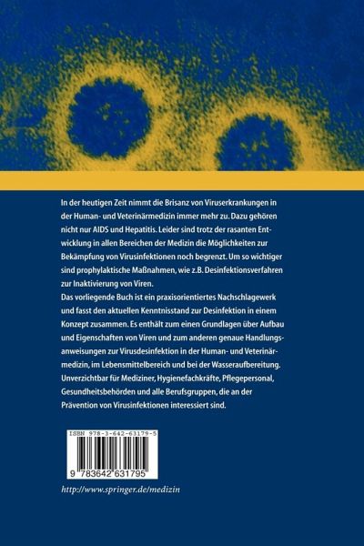 In der heutigen Zeit nimmt die Brisanz von Viruserkrankungen in der Human- und Veterinärmedizin immer mehr zu. Dazu gehören nicht nur AIDS und Hepatitis. Leider sind trotz der rasanten Entwicklung in allen Bereichen der Medizin die Möglichkeiten zur Bekämpfung von Virusinfektionen noch begrenzt. Um so wichtiger sind prophylaktische Maßnahmen, wie z. B. Desinfektionsverfahren zur Inaktivierung von Viren. Das vorliegende Buch ist ein praxisorientiertes Nachschlagewerk und faßt den aktuellen Kenntnisstand zur Desinfektion in einem Konzept zusammen. Es enthält zum einen Grundlagen über Aufbau und Eigenschaften von Viren und zum anderen genaue Handlungsanweisungen zur Virusdesinfektion in der Human- und Veterinärmedizin, im Lebensmittelbereich und bei der Wasseraufbereitung. Unverzichtbar für Mediziner, Hygienefachkräfte, Pflegepersonal, Gesundheitsbehörden und alle Berufsgruppen, die an der Prävention von Virusinfektionen interessiert sind.