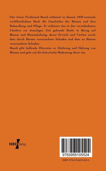 Der Autor Ferdinand Busch erläutert in diesem 1830 erstmals veröffentlichten Buch die Geschichte der Bienen und ihre Behandlung und Pflege. Er erläutert das in den verschiedenen Ländern zur damaligen Zeit geltende Recht in Bezug auf Bienen und Bienenhaltung, deren Erwerb und Verlust sowie dem durch Bienen verursachten Schaden und dem an Bienen verursachten Schaden.