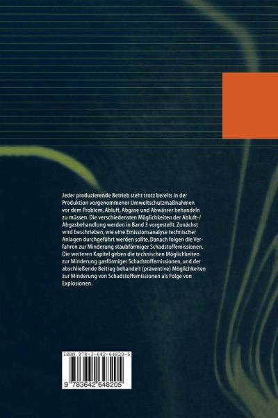 zu Band 3: Additiver Umweltschutz: Behandlung von Abluft und Abgasen.- 1 Emissionsanaylse technischer Anlagen.- 1.1 Einleitung.- 1.2 Emissionsarten.- 1.3 Emissionsquellen.- 1.4 Struktur und Funktionen von Stoff- und Energiewandlungsanlagen.- 1.5 Weg der Schadstoffe und der Trägermedien durch die Produktionsanlage.- 1.6 Technische Maßnahmen zur Minderung von Emissionen.- 1.7 Graphische Darstellung der Emissionen.- Literatur.- Verfahren zur Minderung staubförmiger Schadstoffemissionen.- 2 Physikalische Grundlagen der Partikelabscheidung aus Gasen.- 3 Zyklonabscheider.- 4 Elektroabscheider.- 5 Filternde Abscheider.- 6 Naßabscheider.- 7 Neue Geräte und Verfahren zur Staubabscheidung.- Verfahren zur Minderung gasförmiger Schadstoffemissionen.- 8 Abscheidung gasförmiger Stoffe durch Absorption, Kondensation, Membran-Permeation und Trockensorption.- 9 Abgasbehandlung in Stoffaustauschmaschinen.- 10 Abscheidung gasförmiger Schadstoffe durch Adsorption und Adsorptionskatalyse.- 11 Abbau von Dioxinen und Furanen in Abgasen mit Wasserstoffperoxid.- 12 Abscheidung gasförmiger Schadstoffe durch katalytische Reaktionen.- 13 Abscheidung gasförmiger Schadstoffe durch biologische Reaktionen.- Verfahren zur Minderung von Schadstoffemissionen als Folge von Explosionen.- 14 Explosionen und Emissionen.