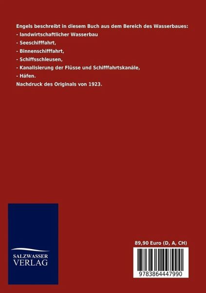 Engels beschreibt in diesem Buch aus dem Bereich des Wasserbaues: - landwirtschaftlicher Wasserbau - Seeschifffahrt, - Binnenschifffahrt, - Schiffsschleusen, - Kanalisierung der Flüsse und Schifffahrtskanäle, - Häfen. Nachdruck des Originals von 1923.