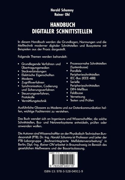 I Grundlagen, Verfahren, Methoden.- 1 Einführung.- 2 Grundlagen und Verfahren.- 3 Übertragungsmedien.- II Physikalische Eigenschaften, Sicherung und Vermittlung.- 4 Steckverbindungen.- 5 Elektrische Eigenschaften.- 6 Modems.- 7 Zugriffsverfahren.- 8 Synchronisation, Codierung, Sicherung.- 9 Steuerungsverfahren.- 10 Vermittlungstechnik.- III Konkrete Schnittstellen und Anwendungen.- 11 Prozessornahe Schnittstellen und Busse.- 12 Parallele Peripherieschnittstellen.- 13 Serielle Peripherieschnittstellen.- 14 Anwendungen (Profile).- 15 Vernetzung.- 16 Testen und Prüfen.- 17 Anhang.- Sachwortverzeichnis.