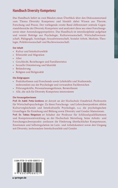 Prof. Dr. habil. Petia Genkova ist derzeit an der Hochschule Osnabrück Professorin für Wirtschaftspsychologie. Zu ihren Forschungs- und Lehrschwerpunkten zählen Kulturvergleichende und Interkulturelle Psychologie, u.a. die psychologischen Grundlagen für Erziehung und Bildung sowie Diversity und Gender Mainstream. Prof. Dr. Tobias Ringeisen ist Inhaber der Professur für Schlüsselqualifikationen und Kompetenzentwicklung an der Hochschule Merseburg. Seine Arbeits- und Forschungsschwerpunkte umfassen die Förderung überfachlicher Kompetenzen, Emotionen und Selbstregulation im Lern- und Arbeitskontext sowie den Umgang mit Diversity, insbesondere Interkulturalität und Gender.