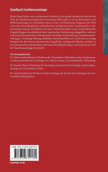 Dieser Band bietet einen umfassenden Einblick in die große thematische Breite und Tiefe der familiensoziologischen Forschung. Dabei geht es um die Konstanten und Differenzierungen des familialen Lebens in den verschiedensten Regionen der Welt sowie die unterschiedlichen methodischen und theoretischen Ansatzpunkte in der Familienforschung. Schließlich wird eine Vielzahl familialer und sozialstruktureller Fragestellungen einschließlich ihrer empirischen Fundierung aufgegriffen, referiert und kritisch kommentiert. Heiratsmarkt, Fertilität, Arbeitsteilung, Generationenbeziehungen, Trennung, Bildung, Mobilität, Familienpolitik und -recht sind nur einige Beispiele für den breiten thematischen Zugriff des vorliegenden Bandes, welcher in vier thematischen Abschnitten und dreiunddreißig Beiträgen systematisch das Feld der Familiensoziologie beschreibt.