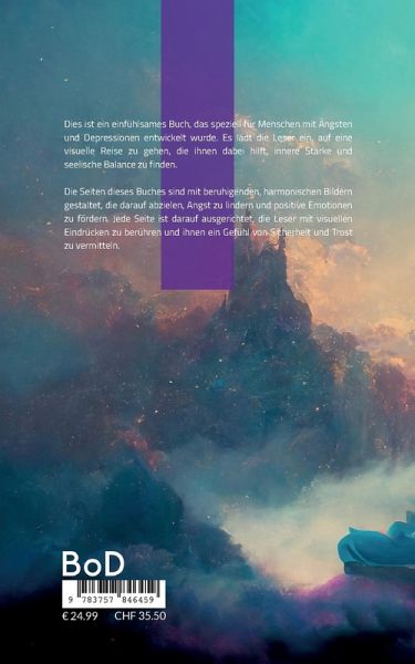 Dies ist ein einfühlsames Buch, das speziell für Menschen mit Ängsten und Depressionen entwickelt wurde. Es lädt die Leser ein, auf eine visuelle Reise zu gehen, die ihnen dabei hilft, innere Stärke und seelische Balance zu finden.Die Seiten dieses Buches sind mit beruhigenden, harmonischen Bildern gestaltet, die darauf abzielen, Angst zu lindern und positive Emotionen zu fördern. Jede Seite ist darauf ausgerichtet, die Leser mit visuellen Eindrücken zu berühren und ihnen ein Gefühl von Sicherheit und Trost zu vermitteln.Die heilende Kraft der Emotionen steht im Mittelpunkt dieses Buches. Während Sie die Seiten durchblättern, werden Sie ermutigt, Ihre eigenen Emotionen zu erkunden und zu akzeptieren. Durch den sanften und beruhigenden visuellen Ausdruck wird die seelische Balance gefördert und ein Gefühl der inneren Stärke aufgebaut."Der heilende Klang der Emotionen" ist eine einfühlsame Begleitung für Menschen, die mit Ängsten und Depressionen kämpfen. Es bietet eine Quelle der Hoffnung, der Inspiration und des Trostes, um ihre Reise der Heilung und des Wohlbefindens zu unterstützen.Tauchen Sie ein in die Welt der heilenden Emotionen und entdecken Sie den Weg zu innerer Stärke und seelischer Balance. Dieses Buch steht Ihnen als vertrauter Begleiter zur Seite, während Sie Ihre Ängste überwinden und Ihre eigene innere Kraft wiederfinden.Herold zu Moschdehner lädt Sie ein, die heilenden Klänge der Emotionen zu entdecken und Ihren Weg zu einem erfüllten Leben der seelischen Balance zu finden.