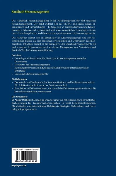 Das Handbuch Krisenmanagement ist ein Nachschlagewerk für post-modernes Krisenmanagement. Der Band widmet sich aus Theorie und Praxis neuen Erkenntnissen und Entwicklungen im Krisenmanagement. Beiträge von 30 Wissenschaftlern und Krisenmanagern befassen sich systematisch mit allen wesentlichen Grundlagen, Strukturen, Handlungsfeldern und Grenzen eines post-modernen Krisenmanagements. Das Handbuch richtet sich an Entscheider im Krisenmanagement und der Krisenkommunikation, die sich mit neuen Systematiken und Denkweisen auseinandersetzen. Inhaltlich nimmt es die Perspektive des Stakeholdermanagements ein und propagiert Krisenmanagement als aktives Management von Ansprüchen und damit als Teil der Unternehmensführung.