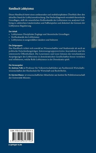 Dieses Handbuch bietet einen umfassenden und multidisziplinären Überblick über den aktuellen Stand der Lobbyismusforschung. Das Nachschlagewerk vermittelt theoretische Grundlagen, stellt die wesentlichen Einflusskanäle des Lobbyismus vor, analysiert Lobbying in zahlreichen Länderstudien und Fallbeispielen und diskutiert die Grenzen der Lobbyismus-Regulierung.
