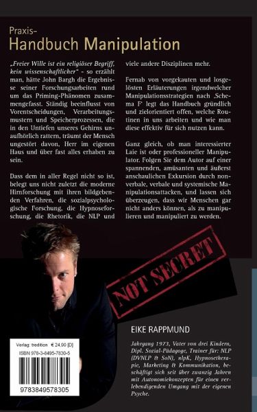 Ein Buch, das aus einem Lehrauftrag für die Spezialeinsatzkräfte der Polizei entstand und nun all den kreativen Manipulateuren und schockierten Manipulierten zur Nutzung offen stehen soll. Ein Buch für echte Macher und Neugierige. Kein Buch für Menschen, die an die Hand genommen werden wollen und das Denken und Entscheiden lieber anderen überlassen.