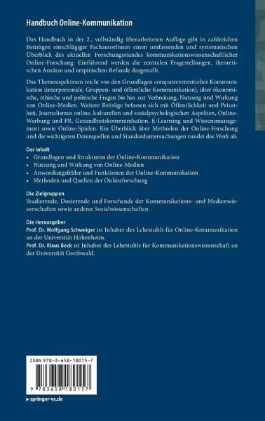 Das Themenspektrum reicht von den Grundlagen computervermittelter Kommunikation (interpersonale, Gruppen- und öffentliche Kommunikation), über ökonomische, ethische und politische Fragen bis hin zur Verbreitung, Nutzung und Wirkung von Online-Medien. Weitere Beiträge befassen sich mit Öffentlichkeit und Privatheit, Journalismus online, kulturellen und sozialpsychologischen Aspekten, Online-Werbung und PR, Gesundheitskommunikation, E-Learning und Wissensmanagement sowie Online-Spielen. Ein Überblick über Methoden der Online-Forschung und die wichtigsten Datenquellen und Standarduntersuchungen rundet das Werk ab.