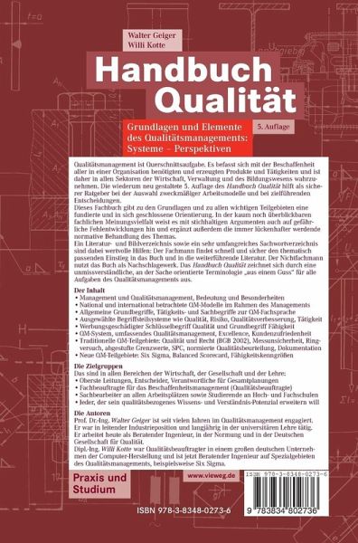"Das Handbuch vermittelt das Rüstzeug für den Qualitätsmanager. Es bietet eine hervorragende Systematik und Begriffsbestimmung. Der Leser lernt auch die wichtigen statistischen und anderen Methoden kennen, die bei der Qualitätsmessung und Qualitätssicherung maßgeblich sind. Die Fülle der vorgestellten Werkzeuge, Methoden und Modelle machen es zu einem wertvollen, aber auch anspruchsvollen Nachschlagewerk."
