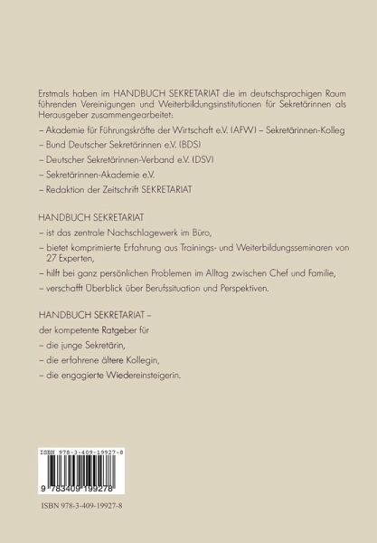 Erstmals haben im HANDBUCH SEKRETARIAT die im deutschsprachigen Raum fUhrenden Vereinigungen und Weiterbildungsinstitutionen als Herausgeber zusam mengearbeitet: - der Bund Deutscher SekreHirinnen e. V. - BDS, - der Deutsche SekreUirinnen-Verband e. V. - DSV, - die Sekretarinnen-Akademie e. V. - SAK, - das Sekretarinnen-Kolleg der Akademie fUr FUhrungskrafte der Wirtschaft e. V. - AFW, - die Redaktion der Zeitschrift SEKRETARIAT. Die Institutionen werden auf den Seiten XX -XXIII vorgestellt. Das HANDBUCH SEKRETARIAT ist das zentrale Nachschlagewerk im BUro. Es bietet komprimierte Erfahrung aus zahlreichen Trainings-und Weiterbildungssemina ren. Autoren, die das Umfeld und die Aufgaben der Sekretarin genau kennen, geben hier nUtzliches Know-how und Anregungen fUr den BUroalltag und besondere Situa tionen weiter: - Teil 1 macht deutlich, welche Anforderungen heute an Sekretarinnen gestellt wer den, und zeigt Perspektiven auf. - Die Beitrage in Teil 2 vermitteln konkretes Know-how zu den Standardaufgaben wie beispielsweise Postbearbeitung, Organisation der Ablage, Vorbereitung von Tagungen und Geschiiftsreisen. - In Teil 3 geht es urn Psychologie und Rhetorik: urn Konfliktmanagement im Sekre tariat, urn GerUchte, wirkungsvolle Prasentation, urn Zeitmanagement und Lebensplanung. - Teil4 enthalt Informationen aus den Bereichen Recht und Wirtschaft, von Arbeits vertrag bis Umweltschutz. - leil 5 gibt Anregungen zur Personlichkeitsentwicklung. - Teil6 umfaBt unter anderem ein Computer-ABC und weitere Informationen zum Nachschlagen. AuBerdem sind in diesem Teil Adressen von Weiterbildungsinstitu tionen und viele andere nUtzliche Adressen aufgefUhrt. So ist das HANDBUCH SEKRETARIAT ein kompetenter Ratgeber fUr die Berufsan fangerin, die erfahrene altere Kollegin und die engagierte Wiedereinsteigerin.