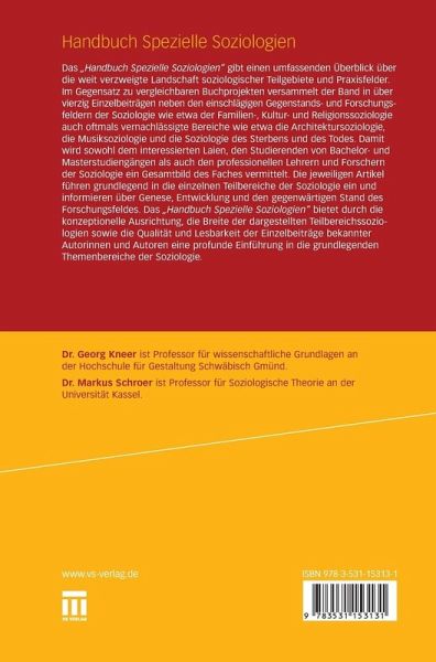 Das "Handbuch Spezielle Soziologien" gibt einen umfassenden Überblick über die weit verzweigte Landschaft soziologischer Teilgebiete und Praxisfelder. Im Gegensatz zu vergleichbaren Buchprojekten versammelt der Band in über vierzig Einzelbeiträgen neben den einschlägigen Gegenstands- und Forschungsfeldern der Soziologie wie etwa der Familien-, Kultur- und Religionssoziologie auch oftmals vernachlässigte Bereiche wie etwa die Architektursoziologie, die Musiksoziologie und die Soziologie des Sterbens und des Todes. Damit wird sowohl dem interessierten Laien, den Studierenden von Bachelor- und Masterstudiengängen als auch den professionellen Lehrern und Forschern der Soziologie ein Gesamtbild des Faches vermittelt. Die jeweiligen Artikel führen grundlegend in die einzelnen Teilbereiche der Soziologie ein und informieren über Genese, Entwicklung und den gegenwärtigen Stand des Forschungsfeldes.