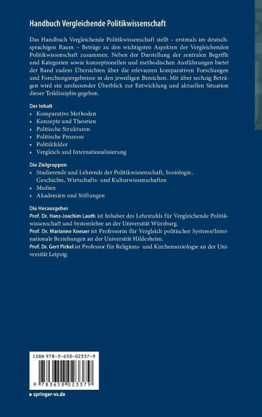 Historische Entwicklungen des Faches.- Methodische Grundlagen und Verfahren: Vergleichsdesigns und komparative Auswertungsverfahren.- Theorien und Konzepte: Systemwandel, Regime, Regierungssysteme, Governance, Institutionen, Gender, Entwicklung, Theorien.- Polities: Staat und Staatsstruktur, Rechtsstaat, Verwaltung u.a.- Politics: Parteien, Wahlen und Partizipation (direkte Demokratie), Parlamente, Verbände und Zivilgesellschaft, politische Kultur, Wertewandel, öffentliche Kommunikation/neue Medien).- Policies: Sozialstaat, Umwelt, Bildung, Steuern, Finanzen, Migration, Militär, Wirtschaftspolitik.- Globalisierung Regionalisierung.