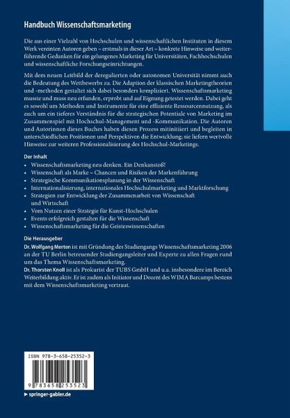 Theorie und Praxis des Wissenschaftsmarketing - Konzepte-Instrumente-Praxisbeispiele.- Wissenschaft und Markt.- Phantomschmerzen - Über die Schwierigkeiten mit dem Wissenschaftsmarketing.- Wissenschaftsmarketing neu denken. Ein Denkanstoß.- Grenzen des Marktes in der Wissenschaft.- Wissenschaft als Marke. Chancen und Risiken der Markenbildung und Markeneinführung im Wissenschaftssystem.- Strategische Kommunikationsplanung in der Wissenschaft. Chancen nutzen mit System.- Internationalisierung, internationales Hochschulmarketing und Marktforschung. Wie Marketing Intelligence im Hochschulsektor zur Organisationsentwicklung und Positionierung von Hochschulen beiträgt.- Strategien zur Entwicklung der Zusammenarbeit von Wissenschaft und Wirtschaft. Insights in Science Marketing, Barrieren und Treiber, Anreizsysteme und Nudges.- Public Affairs als Marketinginstrument der Wissenschaft.- Fundraising - Strategisches Beschaffungs-Marketing für die Wissenschaft.- Wissenschaftsmarketing im Spannungsfeld der Herausforderungen für Führende. Ein holistischer Entwurf wider die Reduktion.- Führen lernen in der Wissenschaft. Eine Marktanalyse zur wissenschaftlichen Weiterbildung.- Events in der Wissenschaft.- Wissenschaftsmarketing am Beispiel des Museums für Naturkunde Berlin.- BIT Verbund - Beutegemeinschaft oder strategische Partnerschaft. Die gemeinsame Antragsstellung des Berliner Hochschulverbundes im Rahmen der BMBF Förderlinie "Innovative Hochschule", ein Praxisbericht.- Strategien für Millionen - Vom Nutzen einer Strategie (insbesondere) für künstlerische Hochschulen.- Wissenschaftsmarketing für die Geisteswissenschaften: Kommunikationskonzept für den Sonderforschungsbereich 933 "Materiale Textkulturen" an der Universität Heidelberg.