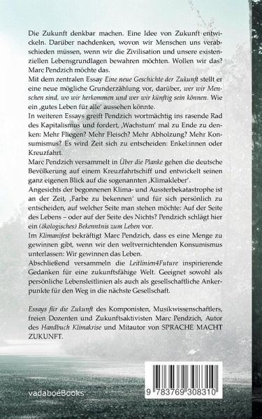 Die Zukunft denkbar machen. Eine Idee von Zukunft entwickeln. Darüber nachdenken, wovon wir Menschen uns verabschieden müssen, wenn wir die Zivilisation und unsere existenziellen Lebensgrundlagen bewahren möchten. Wollen wir das? Marc Pendzich möchte das. Mit dem zentralen Essay Eine neue Geschichte der Zukunft stellt er eine neue mögliche Grunderzählung vor, darüber, wer wir Menschen sind, wo wir herkommen und wer wir künftig sein können. Wie ein gutes Leben für alle aussehen könnte. In weiteren Essays greift Pendzich wortmächtig ins rasende Rad des Kapitalismus und fordert, Wachstum mal zu Ende zu denken: Mehr Fliegen? Mehr Fleisch? Mehr Abholzung? Mehr Konsumismus? Es wird Zeit sich zu entscheiden: Enkel:innen oder Kreuzfahrt. Marc Pendzich versammelt in Über die Planke gehen die deutsche Bevölkerung auf einem Kreuzfahrtschiff und entwickelt seinen ganz eigenen Blick auf die sogenannten Klimakleber. Angesichts der begonnenen Klima- und Aussterbekatastrophe ist an der Zeit, Farbe zu bekennen und für sich persönlich zu entscheiden, auf welcher Seite man stehen möchte: Auf der Seite des Lebens oder auf der Seite des Nichts? Pendzich schlägt hier ein (ökologisches) Bekenntnis zum Leben vor. Im Klimanifest bekräftigt Marc Pendzich, dass es eine Menge zu gewinnen gibt, wenn wir den weltvernichtenden Konsumismus unterlassen: Wir gewinnen das Leben. Abschließend versammeln die Leitlinien4Future inspirierende Gedanken für eine zukunftsfähige Welt. Geeignet sowohl als persönliche Lebensleitlinien als auch als gesellschaftliche Ankerpunkte für den Weg in die nächste Gesellschaft. Essays für die Zukunft des Komponisten, Musikwissenschaftlers, freien Dozenten und Zukunftsaktivisten Marc Pendzich, Autor des Handbuch Klimakrise und Mitautor von SPRACHE MACHT ZUKUNFT.
