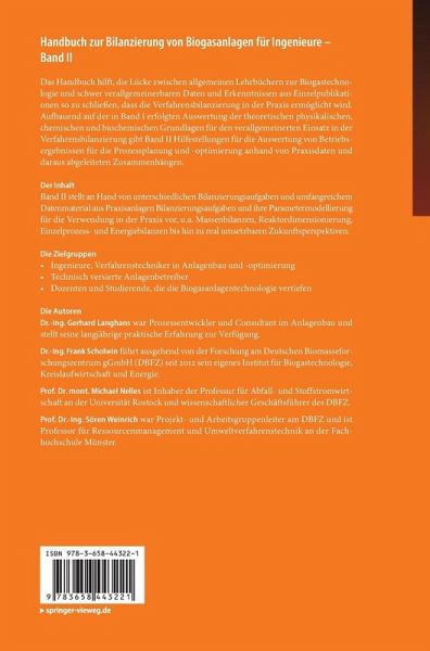 Dr.-Ing. Gerhard Langhans war Prozessentwickler und Consultant im Anlagenbau und stellt seine langjährige praktische Erfahrung zur Verfügung. Dr.-Ing. Frank Scholwin führt ausgehend von der Forschung am Deutschen Biomasseforschungszentrum gGmbH (DBFZ) seit 2012 sein eigenes Institut für Biogastechnologie, Kreislaufwirtschaft und Energie. Prof. Dr. mont. Michael Nelles ist Inhaber der Professur für Abfall- und Stoffstromwirtschaft an der Universität Rostock und wissenschaftlicher Geschäftsführer des DBFZ. Prof. Dr.-Ing. Sören Weinrich war Projekt- und Arbeitsgruppenleiter am DBFZ und ist Professor für Ressourcenmanagement und Umweltverfahrenstechnik an der Fachhochschule Münster.