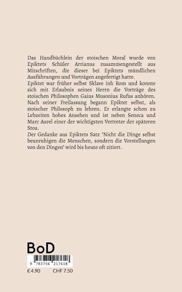 Das Handbüchlein der stoischen Moral wurde von Epiktets Schüler Arrianus zusammengestellt aus Mitschriften, die dieser bei Epiktets mündlichen Ausführungen und Vorträgen angefertigt hatte. Epiktet kam früher selbst als Sklave nach Rom und konnte sich mit Erlaubnis seines Herrn die Vorträge des stoischen Philosophen Gaius Musonius Rufus anhören. Nach seiner Freilassung begann Epiktet selbst, als stoischer Philosoph zu lehren. Er erlangte schon zu Lebzeiten hohes Ansehen und ist neben Seneca und Marc Aurel einer der wichtigsten Vertreter der späteren Stoa.Der Gedanke aus Epiktets Satz "Nicht die Dinge selbst beunruhigen die Menschen, sondern die Vorstellungen von den Dingen" wird bis heute oft zitiert.