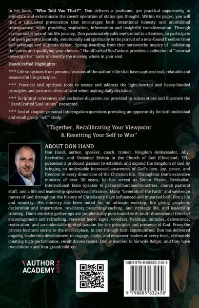 In his book, "Who Told You That?", Don delivers a profound, yet practical opportunity to stimulate and exterminate the covert operation of status quo thought. Within its pages, you will find a calculated provocation that encourages both intentional honesty and uninhibited transparency, while providing inspiration, information and insightful transformation. Through various snapshots of his life journey, Don passionately calls one's mind to attention, to participate and even perspire mentally, emotionally and spiritually in the pursuit of a new-found freedom from self-sabotage and ultimate defeat. Spring-boarding from that noteworthy inquiry of "validating the voices and qualifying your choices," HandCrafted Soul'utions provides a collection of "internal investigative" tools to identify the missing "WHOLE" in your soul. HandCrafted Highlights: *** Life snapshots from personal seasons of the author's life that have captured real, relatable and resourceful life principles. *** Practical and spiritual tools to assess and address the light-hearted and heavy-handed principles and postures often utilized when making daily decisions. *** Scriptural references and exclusive diagrams are provided to substantiate and illustrate the "HandCrafted Soul'utions" presented. *** End of chapter personal interrogation questions providing an opportunity for both individual and small group "self" study. "Together, Recalibrating Your Viewpoint and Resetting Your Self to Win"