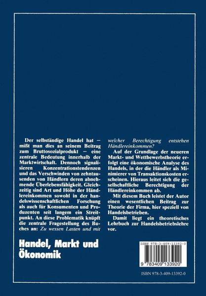 1. Einleitung.- 2. Transaktions- und Organisationsstruktur der Händlerposition: Freiheit, Abhängigkeit und Ausbeutungsverdacht.- 3. Indikatoren des rollen-bedingten Ausbeutungsverdachtes.- 31. Das Handelsspannen-Syndrom.- 32. Arbeitsethik und Händlereinkommen.- 33. Nutzensteigerung durch Umverteilung von Gütern.- 34. Dominanz nicht beobachtbarer Variabler.- 35. Economies of Scale (Größenwachstum und Konzentration).- 36. Der "Lighthouse-Effect".- 37. Doppelspurigkeit bzw. Übersetzung im Handel.- 38. Zusammenfassung.- 4. Die Mittlerstellung der Händler: Beziehungen zwischen Produktion und Konsumtion.- 41. Methodische Vorbemerkung: Wie erkennt man eigentlich die gesamtwirtschaftliche Bedeutung des Handels?.- 42. Möglichkeiten und Grenzen einer Deskription des Handels.- 43. Handel als Institution zur Vermeidung von Marktungleichgewicht und Ressourcenverschwendung.- 44. Anbieter und Nachfrager in der ökonomischen Theorie des Marktes.- 5. Die Rolle der Händler.- 51. Das duale System des Handels.- 52. Ideologie und Technik der Anti-Händler.- 53. Rollen-bedingte ökonomische Strukturprobleme der Händler.- 6. Die Elemente der Händlerrolle als Gegenstand der ökonomischen Theorie.- 61. Die Theorie komparativer Kostenvorteile (RICARDO, 1817).- 62. Die Theorie komparativer Nutzenvorteile (EDGEWORTH, 1881; H. H. WEBER, 1966).- 63. Deskriptiv orientierte Theorieansätze.- 64. Theorien zur Operationalisierung handelsbedingter Kostenvorteile.- 65. Marktorientierte Theorien zur Erklärung handelsbedingter Effizienzvorteile.- 7. HandeIs-"Unternehmung" und Transaktionskosten.- 71. The Nature of the Firm (COASE, 1937).- 72. Kritik und Möglichkeiten der Erweiterung des Transaktionskostenansatzes.- 73. Die Handelsunternehmung als Transaktionskosten-Spezialist.- 74.Interdependenzen zwischen Produktions- und Transaktionskosten.- 8. Der Markt und alternative Distributionssysteme.- 81. Die (autarke) Familie: Unabhängigkeit der Alimentation von Produktionsbeiträgen der Mitglieder.- 82. Die Nutzen-Opfer-Interdependenz.- 83. Die Kosten-Nutzen-Interdependenz: Das SRAFFA-Modell.- 84. Grundmuster einer Zuordnung von Gütern auf Personen.- 85. Historische Organisationsformen der Güterverteilung.- 9. Handelsgewinn, Transaktionskosten und Markt: Handelsunternehmung vs. Zentralinstanz.- 91. Grundprobleme einer Gewinnlegitimation.- 92. Markttheorie und Gewinn.- 93. Marktgleichgewicht, Gewinnillusion und Rechnungswesen.- 94. Marktorientierte Vollkostenrechnung im Mehrproduktfall.- 95. Transaktionskosten und Unternehmungsgewinne.- 96. Die Organisation der Produktion und der Transaktion: Die Wahl zwischen Zentralität und Dezentralität (Markt und Unternehmung).- 97. Zusammenfassung.- 10. Fazit.- Namenregister.