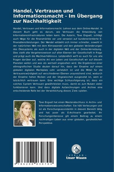 Handel, Vertrauen und Informationsmacht. Lehren aus dem Online-Handel. In diesem Buch geht es darum, wie Vertrauen die Entwicklung von Informationsinfrastrukturen leiten kann. Die Autorin, Tove Engvall, schlägt auch Wege für die Finanzmärkte vor und verweist auf kundenorientierte E-Finanzdienstleistungen. Der Wandel vollzieht sich immer schneller, sowohl in der natürlichen Welt mit dem Klimawandel und den globalen Veränderungen des Ökosystems als auch in der digitalen Welt und der Online-Vernetzung. Dies stellt alte Vorgehensweisen auf allen Ebenen der Gesellschaft in Frage und prägt auch die Machtverhältnisse. Letztendlich wirft es auch für uns alle Fragen darüber auf, welche Art von Leben und Gesellschaft wir auf diesem Planeten wollen und was als wertvoll angesehen wird. Die Ergebnisse einer ethnografischen Studie deuten darauf hin, dass der Einzelne auf einem globalen digitalen Marktplatz sehr verletzlich ist und die Mittel für die Vertrauenswürdigkeit auf verschiedenen Ebenen unzureichend sind, wodurch der Einzelne hohen Risiken und der Ungewissheit ausgesetzt ist, wem er tatsächlich vertrauen kann. Eine wichtige Schlussfolgerung ist, dass ein solches System Vertrauen gewährleisten muss, damit es zum Nutzen vieler funktionieren kann. Und dass digitale Aufzeichnungen und Archive eine entscheidende Rolle bei der Verwirklichung dieses Ziels spielen.