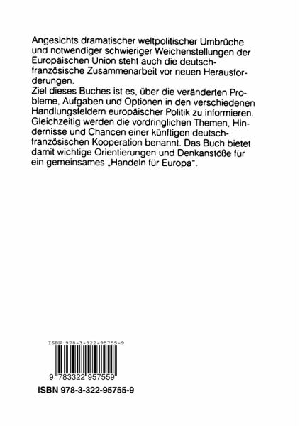 Fragen zu Europa.- Erster Teil Außen- und sicherheitspolitische Herausforderungen.- Die deutsch-französische Zusammenarbeit in der Gemeinsamen Außen- und Sicherheitspolitik der Europäischen Union.- Die Vereinigten Staaten als Faktor der deutsch-französischen Beziehungen.- Paris, Bonn, Moskau: Ein Dreieck für Europa.- Die UNO und das deutsch-französische Paar.- Die militärisch-industrielle Zusammenarbeit, die deutsch-französische Kooperation und die europäische Verteidigung.- Deutschland, Frankreich und die EFTA-Erweiterung der Europäischen Union.- Deutschland, Frankreich und die Osterweiterung der Europäischen Union.- Frankreich, Deutschland und Polen. Ein neues Gespann - Eine Herausforderung für die Zukunft.- Zwischen Konflikt und Konsens: Frankreich, Deutschland und der Konflikt im ehemaligen Jugoslawien.- Europa und der Nahe Osten - Die Konsequenzen aus dem Ende des Kalten Krieges.- Frankreich und die arabische Welt: Eine Neuorientierung auf das westliche Mittelmeer und den Maghreb.- Zweiter Teil Wirtschaftliche und gesellschaftliche Herausforderungen.- Wettbewerbsfähigkeit und Industriepolitik: Deutsche und französische Strategien.- Für eine deutsch-französische Währungsunion.- Handelspolitik - Ein Zankapfel zwischen Deutschland und Frankreich?.- Was brächte eine deutsch-französische Beschäftigungsinitiative? Zur Rezeption des EU-Weißbuchs in Deutschland und Frankreich.- Frankreich-Deutschland: Zwei Logiken sozialer Modernisierung - Folgen für den Sozialraum Europa.- Die französische Politik der Einwanderung, der Integration und der Staatsbürgerschaft.- Migration, gesellschaftlicher Wandel und politische Steuerung in Deutschland.- Gemeinschaft der Verschmutzer.- Dritter Teil Bilanz und Empfehlungen.- Frankreich und die EuropäischeUnion: Vom Maastrichter Vertrag zur Regierungskonferenz von 1996.- Handeln für Europa.- Angaben zu den Autoren.- Abkürzungsverzeichnis.- Auswahlbibliographie.- Sachindex.- Personenindex.