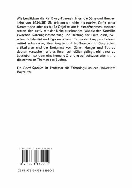 Wie bewältigen die Kel Ewey-Tuareg in Niger die Dürre und Hungerkrise von 1984/85? Sie erleben sie nicht als passive Opfer einer Katastrophe oder als bloße Objekte von Hilfsmaßnahmen, sondern setzen sich aktiv mit der Krise auseinander. Wie sie den Konflikt zwischen Nahrungsbeschaffung und Rettung der Tiere lösen, zwischen Solidarität und Egoismus beim Teilen der knappen Lebensmittel schwanken, ihre Ängste und Hoffnungen in Gesprächen artikulieren unddie Ereignisse von Dürre, Hunger und Tod zu deuten versuchen, wie es ihnen schließlich gelingt, nicht nur zu überleben, sondern eine humane Ordnung aufrechtzuerhalten, sind die zentralen Themen dieses Buches.