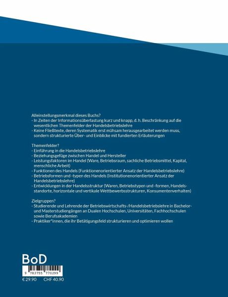 Alleinstellungsmerkmal dieses Buchs?- In Zeiten der Informationsüberlastung kurz und knapp, d. h. Beschränkung auf die wesentlichen Themenfelder der Handelsbetriebslehre- Keine Fließtexte, deren Systematik erst mühsam herausgearbeitet werden muss, sondern strukturierte Über- und Einblicke mit fundierten Erläuterungen Themenfelder?- Einführung in die Handelsbetriebslehre- Beziehungsgefüge zwischen Handel und Hersteller- Leistungsfaktoren im Handel (Ware, Betriebsraum, sachliche Betriebsmittel, Kapital, menschliche Arbeit)- Funktionen des Handels (Funktionenorientierter Ansatz der Handelsbetriebslehre)- Betriebsformen und -typen des Handels (Institutionenorientierter Ansatz der Handelsbetriebslehre)- Entwicklungen in der Handelsstruktur (Waren, Betriebstypen und -formen, Handelsstandorte, horizontale und vertikale Wettbewerbsstrukturen, Konsumentenverhalten)Zielgruppen?- Studierende und Lehrende der Betriebswirtschafts-/Handelsbetriebslehre in Bachelor- und Masterstudiengängen an Dualen Hochschulen, Universitäten, Fachhochschulen sowie Berufsakademien- Praktiker_innen, die ihr Betätigungsfeld strukturieren und optimieren wollen