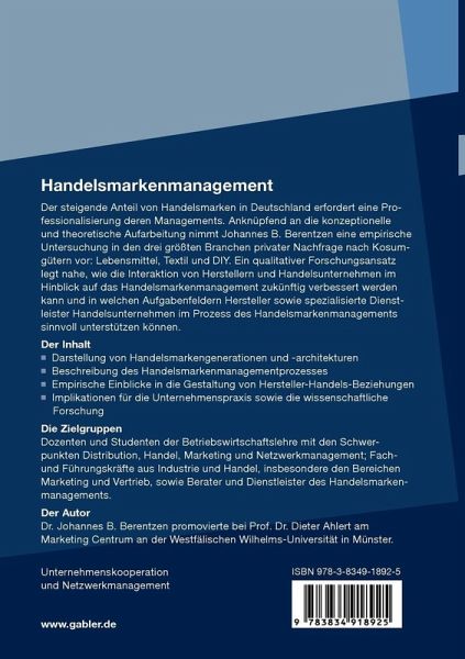 Der steigende Anteil von Handelsmarken in Deutschland erfordert eine Professionalisierung deren Managements. Anknüpfend an die konzeptionelle und theoretische Aufarbeitung nimmt Johannes B. Berentzen eine empirische Untersuchung in den drei größten Branchen privater Nachfrage nach Konsumgütern vor: Lebensmittel, Textil und DIY. Ein qualitativer Forschungsansatz legt nahe, wie die Interaktion von Herstellern und Handelsunternehmen im Hinblick auf das Handelsmarkenmanagement zukünftig verbessert werden kann und in welchen Aufgabenfeldern Hersteller sowie spezialisierte Dienstleister Handelsunternehmen im Prozess des Handelsmarkenmanagements sinnvoll unterstützen können.