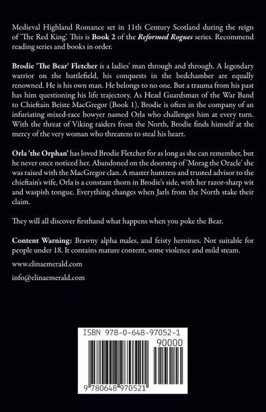 Brodie 'The Bear' Fletcher is a ladies' man through and through. A legendary warrior on the battlefield, his conquests in the bedchamber are equally renowned. He is his own man. He belongs to no one. But a trauma from his past has him questioning his life trajectory. As Head Guardsman of the War Band to Chieftain Beiste MacGregor (Book 1), Brodie is often in the company of an infuriating mixed-race bowyer named Orla who challenges him at every turn. With the threat of Viking raiders from the North, Brodie finds himself at the mercy of the very woman who threatens to steal his heart. Orla 'the Orphan' has loved Brodie Fletcher for as long as she can remember, but he never once noticed her. Abandoned on the doorstep of 'Morag the Oracle' she was raised with the MacGregor clan. A master huntress and trusted advisor to the chieftain's wife, Orla is a constant thorn in Brodie's side, with her razor-sharp wit and waspish tongue. Everything changes when Jarls from the North stake their claim. They will all discover firsthand what happens when you poke the Bear. Warning: Brawny alpha males, historical inaccuracies and frivolous entertainment. Not suitable for readers under the age of 18. It contains mature content.