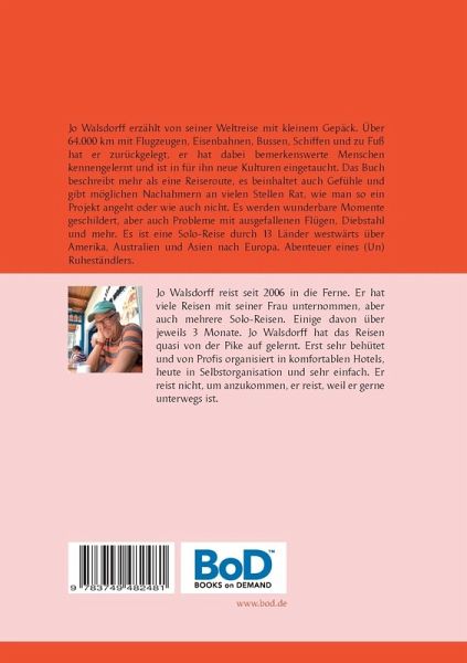 Jo Walsdorff erzählt von seiner Weltreise mit kleinem Gepäck. Über 64.000 km mit Flugzeugen, Eisenbahnen, Bussen, Schiffen und zu Fuß hat er zurückgelegt, er hat dabei bemerkenswerte Menschen kennengelernt und ist in für ihn neue Kulturen eingetaucht. Das Buch beschreibt mehr als eine Reiseroute, es beinhaltet auch Gefühle und gibt möglichen Nachahmern an vielen Stellen Rat, wie man so ein Projekt angeht oder wie auch nicht. Es werden wunderbare Momente geschildert, aber auch Probleme mit ausgefallenen Flügen, Diebstahl und mehr. Es ist eine Solo-Reise durch 13 Länder westwärts über Amerika, Australien und Asien nach Europa. Abenteuer eines (Un)Ruheständlers.