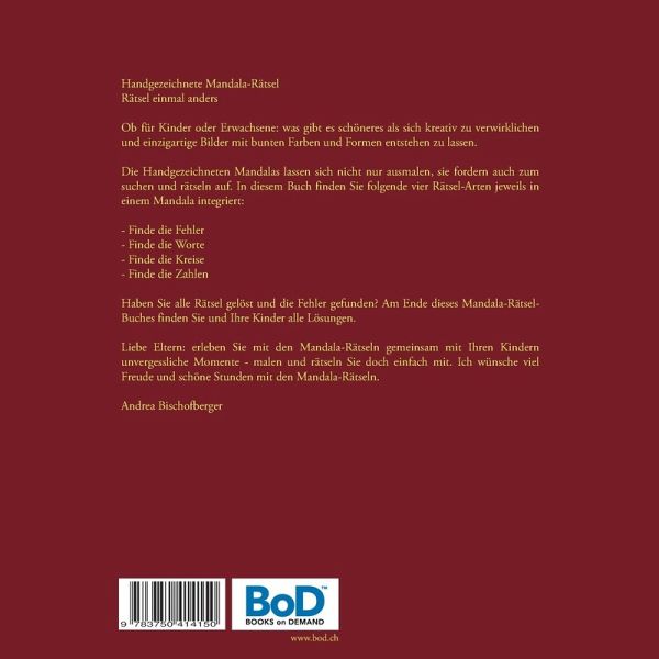 Handgezeichnete Mandala-RätselRätsel einmal andersOb für Kinder oder Erwachsene: was gibt es schöneres als sich kreativ zu verwirklichen und einzigartige Bilder mit bunten Farben und Formen entstehen zu lassen.Die Handgezeichneten Mandalas lassen sich nicht nur ausmalen, sie fordern auch zum suchen und rätseln auf. In diesem Buch finden Sie folgende vier Rätsel-Arten jeweils in einem Mandala integriert:- Finde die Fehler- Finde die Worte- Finde die Kreise- Finde die ZahlenHaben Sie alle Rätsel gelöst und die Fehler gefunden? Am Ende dieses Mandala-Rätsel-Buches finden Sie und Ihre Kinder alle Lösungen.Liebe Eltern: erleben Sie mit den Mandala-Rätseln gemeinsam mit Ihren Kindern unvergessliche Momente - malen und rätseln Sie doch einfach mit. Ich wünsche viel Freude und schöne Stunden mit den Mandala-Rätseln.Andrea Bischofberger