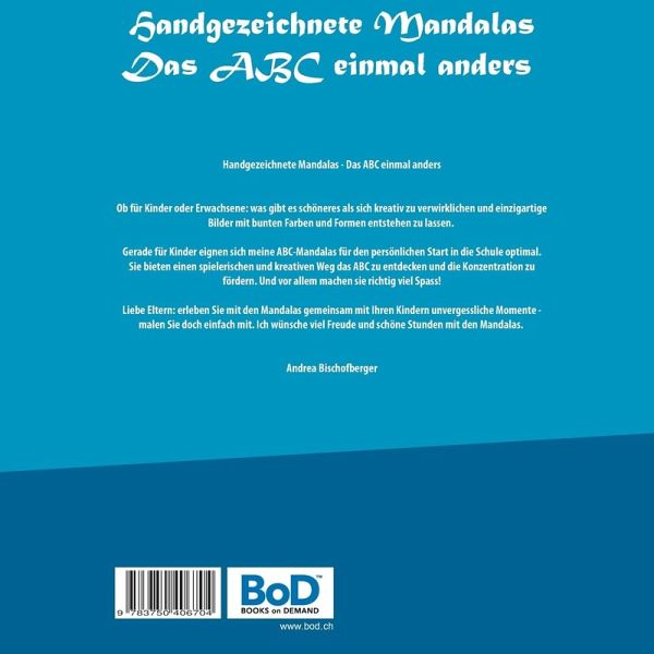 Handgezeichnete Mandalas - Das ABC einmal andersOb für Kinder oder Erwachsene: was gibt es schöneres als sich kreativ zu verwirklichen und einzigartige Bilder mit bunten Farben und Formen entstehen zu lassen. Gerade für Kinder eignen sich meine ABC-Mandalas für den persönlichen Start in die Schule optimal. Sie bieten einen spielerischen und kreativen Weg das ABC zu entdecken und die Konzentration zu fördern. Und vor allem machen sie richtig viel Spass!Liebe Eltern: erleben Sie mit den Mandalas gemeinsam mit Ihren Kindern unvergessliche Momente - malen Sie doch einfach mit. Ich wünsche viel Freude und schöne Stunden mit den Mandalas. Andrea Bischofberger