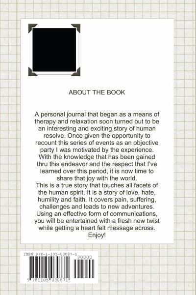 ABOUT THE BOOK A personal journal that began as a means of therapy and relaxation soon turned out to be an interesting and exciting story of human resolve. Once given the opportunity to recount this series of events as an objective party I was motivated by the experience. With the knowledge that has been gained thru this endeavor and the respect that I've learned over this period, it is now time to share that joy with the world. This is a true story that touches all facets of the human spirit. It is a story of love, hate, humility and faith. It covers pain, suffering, challenges and leads to new adventures. Using an effective form of communications, you will be entertained with a fresh new twist while getting a heart felt message across. Enjoy!