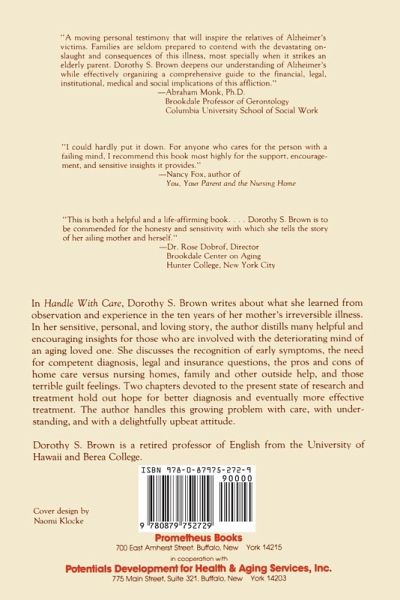 A sensitive and loving story, Handle With Care is a sympathetic portrayal of the difficulties and trauma of caring for a parent suffering from the progressive deterioration of his or her mental facilities. Describing her mother's long, irreversible illness, Dorothy Brown candidly relates her feelings of shock, despair, and bewilderment and her later feelings of guilt, resentment, and sadness. More than just a personal account, this book is a valuable discussion of the symptoms of Alzheimer's disease, the options for care and/or treatment, and the financial and legal issues. Ms. Brown stresses the need for early diagnosis and points out that "senility" (a convenient catch-all term) is hardly accurate and is often misleading, allowing one to accept as inevitable what may in fact be treatable. She also describes the findings of research that hold out hope for better diagnosis and more effective treatment in the future.