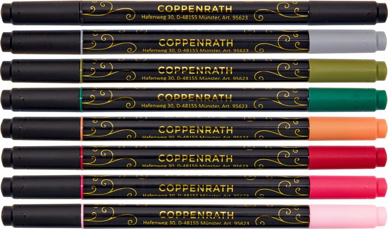 Im Set enthalten sind 8 Doppelfasermaler mit zwei unterschiedlichen Spitzen: 1 Pinselspitze und 1 Fineliner-Spitze.