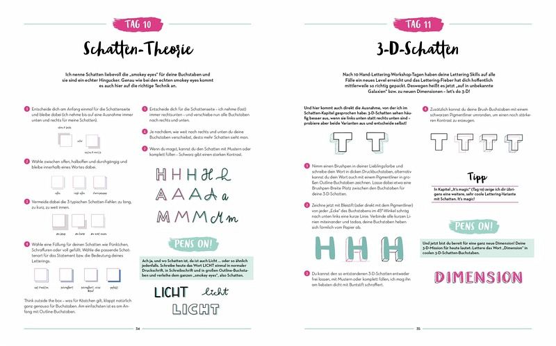 Mit dem praktischen Workshop lernen Anfänger die Kunst des Handletterings spielerisch! Nach einer Einführung in die Grundbegriffe wie Modern Handlettering, Brush Lettering, Chalk Lettering und Infos zu Papier und Stiften, geht es direkt los mit den Daily Challenges. Die 30 Lektionen decken alles ab, was man wissen und können muss, um ein richtiger Lettering Artist zu werden: Wie schreibt man Druckbuchstaben, Schreibschriftbuchstaben, Serifen? Was sind Outlines und wie gelingen sie? Welche Tricks und Variationen gibt es für Schatten, Hintergründe und vieles mehr? All diese und weitere Fragen werden beantwortet und mit praktischen Übungen wird das Gelernte direkt umgesetzt. In den Lektionen enthalten sind auch sieben wunderschöne Alphabete und spannende Extras wie Lettering Design, Buchstaben-Mix-Technik und Letter Patterns.