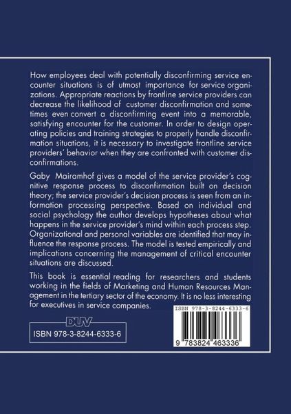 How employees deal with potentially disconfirming service encounter situations is of utmost importance for service organizations. Appropriate reactions by frontline service providers can decrease the likelihood of customer disconfirmation and sometimes even convert a disconfirming event into a memorable, satisfying encounter for the customer. In order to design operating policies and training strategies to properly handle disconfirmation situations, it is necessary to investigate frontline service providers' behavior when they are confronted with customer disconfirmations. Gaby Mairamhof gives a model of the service provider's cognitive response process to disconfirmation built on decision theory; the service provider's decision process is seen from an information processing perspective. Based on individual and social psychology the author develops hypotheses about what happens in the service provider's mind within each process step. Organizational and personal variables are identified that may influence the response process. The model is tested empirically and implications concerning the management of critical encounter situations are discussed.
