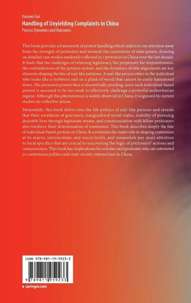 This book provides a framework of protest handling which redirects our attention away from the strength of protesters and towards the constraints of state power, drawing on detailed case studies randomly collected in 7 provinces in China over the last decade. It finds that the challenges of retaining legitimacy, the propensity for responsiveness, the contradictions of the petition system, and the dynamics of elite alignments are key elements shaping the fate of nail-like petitions. A nail-like person refers to the individual who looks like a stubborn nail on a plank of wood that cannot be easily hammered down. His persistent protest thus is theoretically puzzling, since such individual-based protest is assumed to be too weak to effectively challenge a powerful authoritarian regime. Although this phenomenon is widely observed in China, it is ignored by current studies on collective action. Meanwhile, this book delves into the life politics of nail-like persons and reveals that their escalation of grievance, marginalized social status, inability of pursuing desirable lives through legitimate means, and communication with fellow petitioners also reinforce their determination of contention. This book describes deeply the fate of individual-based protests in China. It scrutinizes the state's role in shaping contention at its macro, intermediate, and micro levels, and meanwhile pay more attention to local specifics that are crucial to uncovering the logic of petitioners' actions and consciousness. This book has implications for scholars and graduates who are interested in contentious politics and state-society interactions in China.