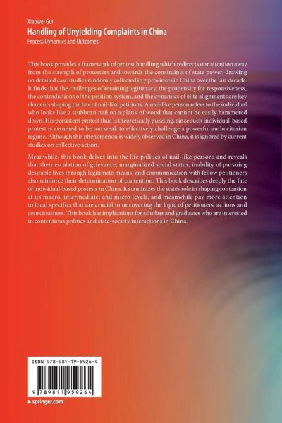 This book provides a framework of protest handling which redirects our attention away from the strength of protesters and towards the constraints of state power, drawing on detailed case studies randomly collected in 7 provinces in China over the last decade. It finds that the challenges of retaining legitimacy, the propensity for responsiveness, the contradictions of the petition system, and the dynamics of elite alignments are key elements shaping the fate of nail-like petitions. A nail-like person refers to the individual who looks like a stubborn nail on a plank of wood that cannot be easily hammered down. His persistent protest thus is theoretically puzzling, since such individual-based protest is assumed to be too weak to effectively challenge a powerful authoritarian regime. Although this phenomenon is widely observed in China, it is ignored by current studies on collective action. Meanwhile, this book delves into the life politics of nail-like persons and reveals that their escalation of grievance, marginalized social status, inability of pursuing desirable lives through legitimate means, and communication with fellow petitioners also reinforce their determination of contention. This book describes deeply the fate of individual-based protests in China. It scrutinizes the state's role in shaping contention at its macro, intermediate, and micro levels, and meanwhile pay more attention to local specifics that are crucial to uncovering the logic of petitioners' actions and consciousness. This book has implications for scholars and graduates who are interested in contentious politics and state-society interactions in China.